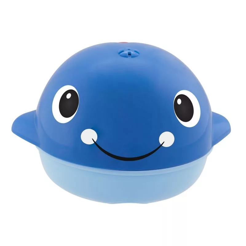 A játék hátán lévő gomb megnyomása után a bálna vizet spriccel.