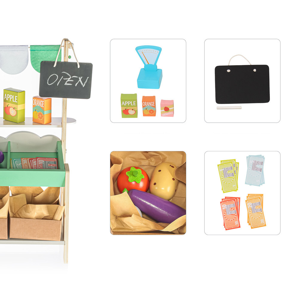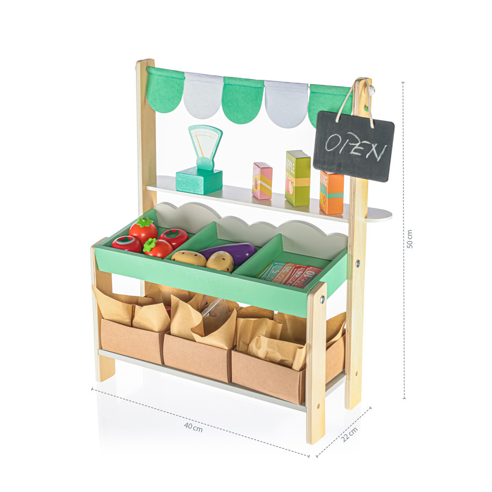 A bódé egy táblával van felszerelve, amelyre a gyerekek krétával felírhatják az árakat és a napi ajánlatokat, vagy maguk határozhatják meg, hogy a stand nyitva vagy zárva van-e. A képzeletnek nincs határa, a gyerekeknek rengeteg kalandban lesz része a kereskedés során. A bódéban három fadoboz található, amelyek úgy néznek ki, mint egy zöldségestől származó valódi doboz, valamint több fából készült gyümölcs és zöldség.