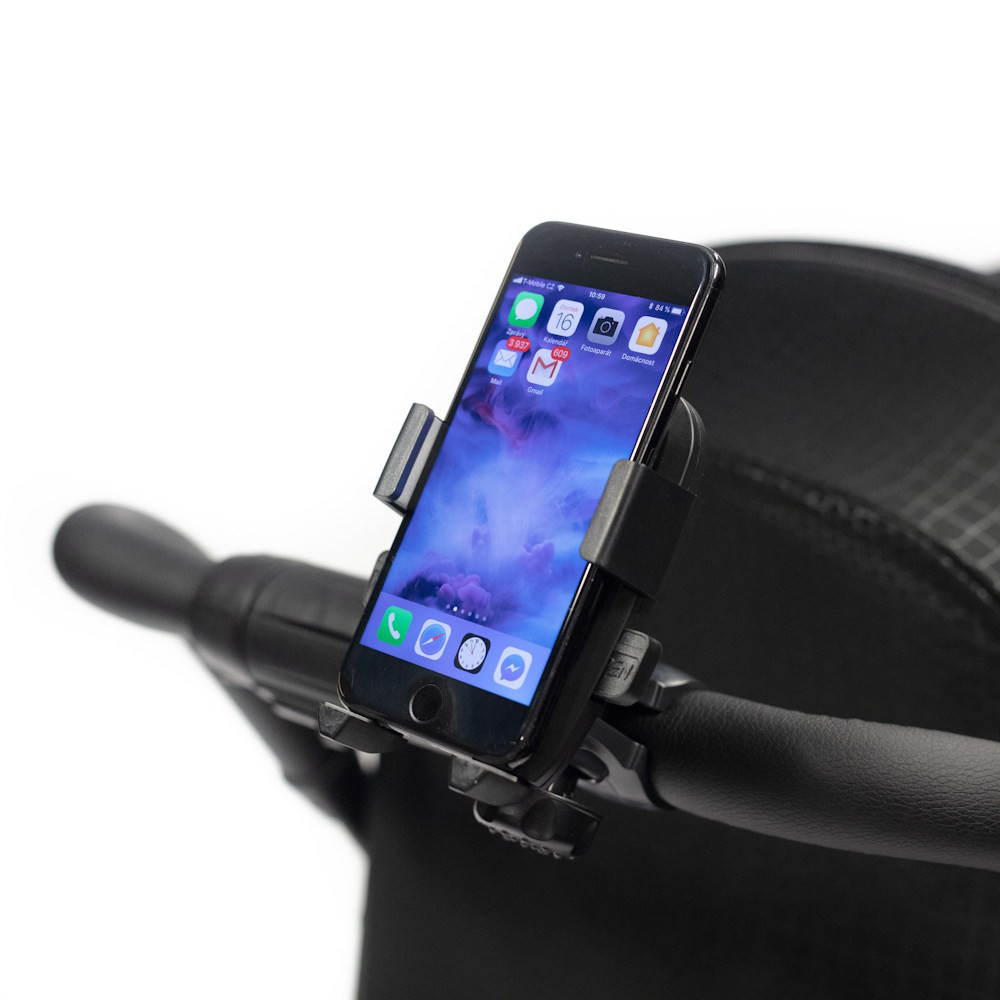 A telefon egyszerűen, egy kézzel behelyezhető a tartóba, amelyet ehhez nem kell levenni a babakocsiról.