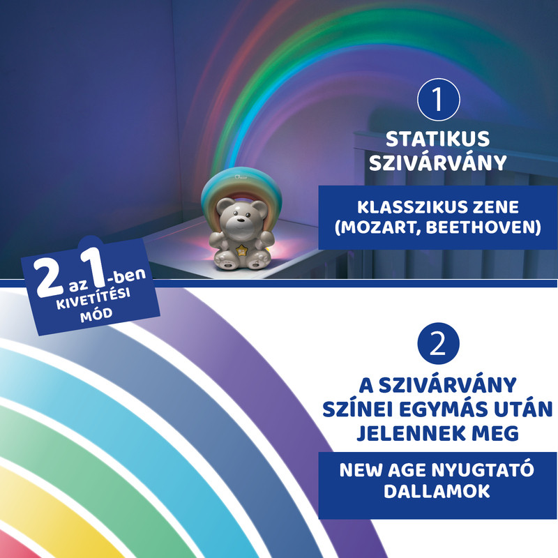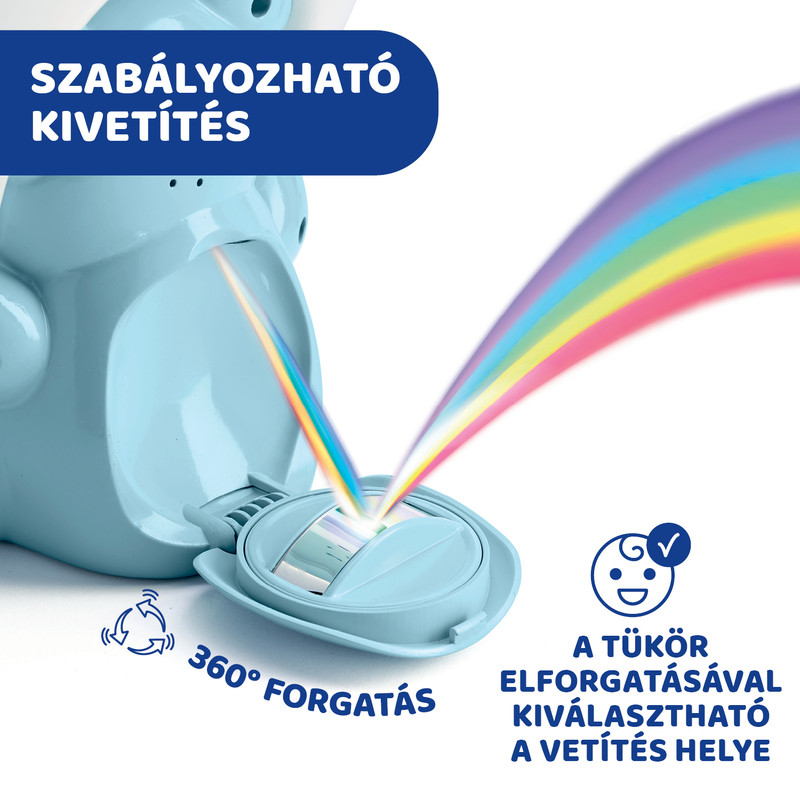 A szivárványos kivetítő megfelelő légkört teremt a pihenéshez és az alváshoz. Klasszikus és new age dallamok. A vetítési mód és a dallamok kiválasztása mellett a plafonra vagy a falra vetített szivárvány mérete is beállítható attól függően, hogy hol szeretné elhelyezni a terméket. A szivárvány fények kivetítés legjobb eredménye érdekében használja a terméket korlátozott megvilágítású vagy árnyékos környezetben. A hangerő szabályozható.