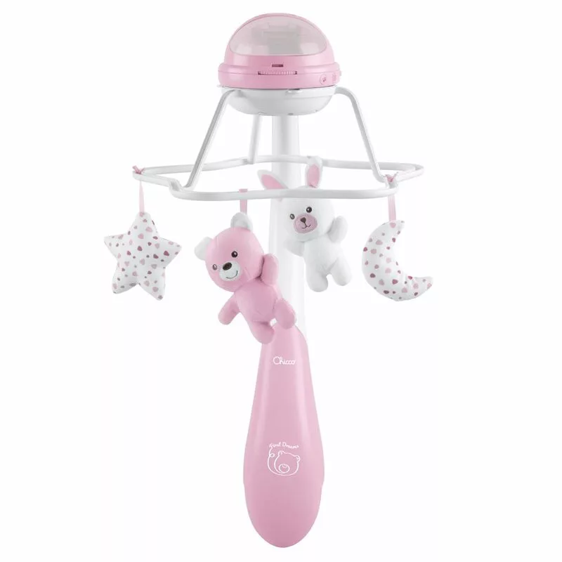A praktikus távirányító lehetővé teszi a 3 elektronikus funkció testreszabását azáltal, hogy egyenként kiválaszthatjuk a kívánt kombinációt: a 4 textilfigura forgatása, pihentető dallamok lejátszása és szivárványvetítés.