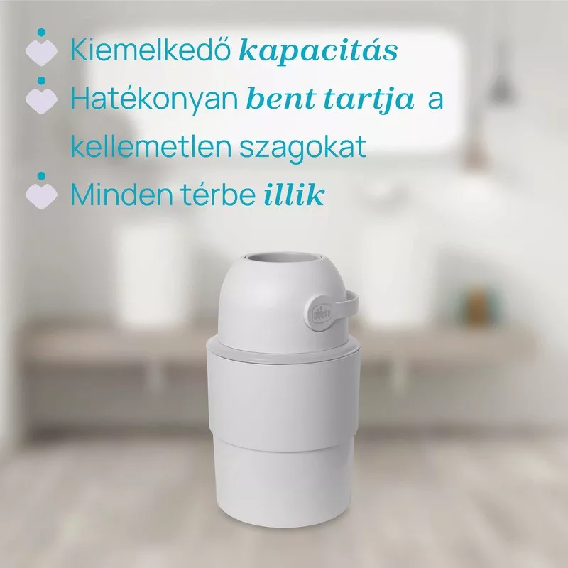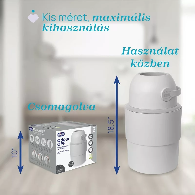 Használható hagyományos műanyag zacskókkal vagy az ODOUR OFF Chicco zacskókkal, melyek mérete tökéletesen illeszkedik a pelenkatartó belső kapacitásához.