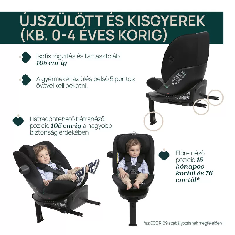 40-150 cm-ig (újszülött kortól - 12 éves korig) minden konfigurációban IsoFixesen köthető be az ülés a maximális stabilitásért.