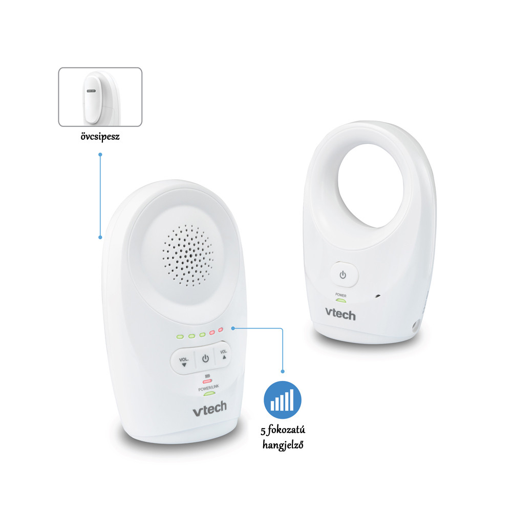 A V-Tech BM1111 egyirányú babaőrző DECT technológiájának köszönhetően interferencia mentes, kristálytiszta hangátvitellel működik. Hatótávolsága nyílt terepen 460 méter.