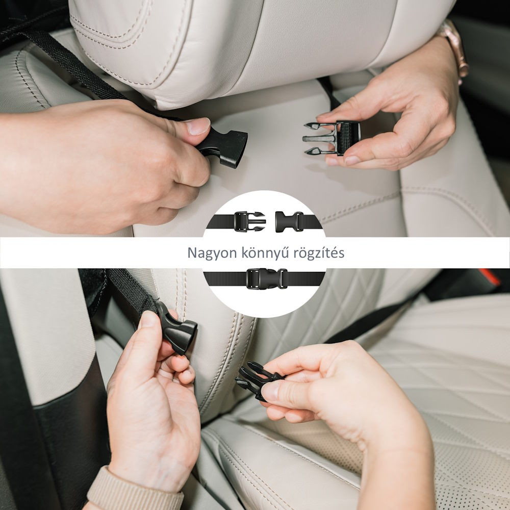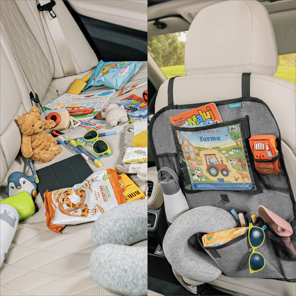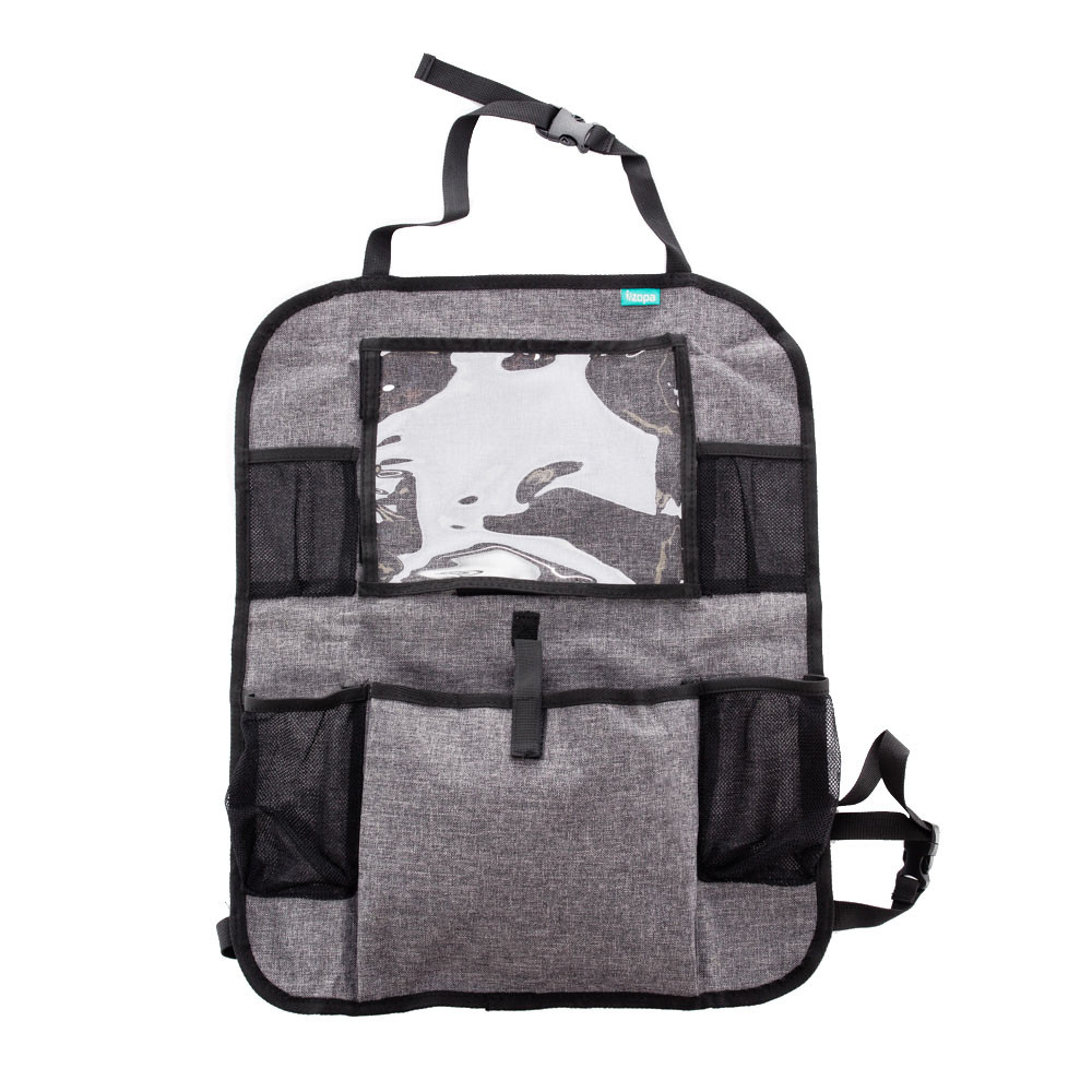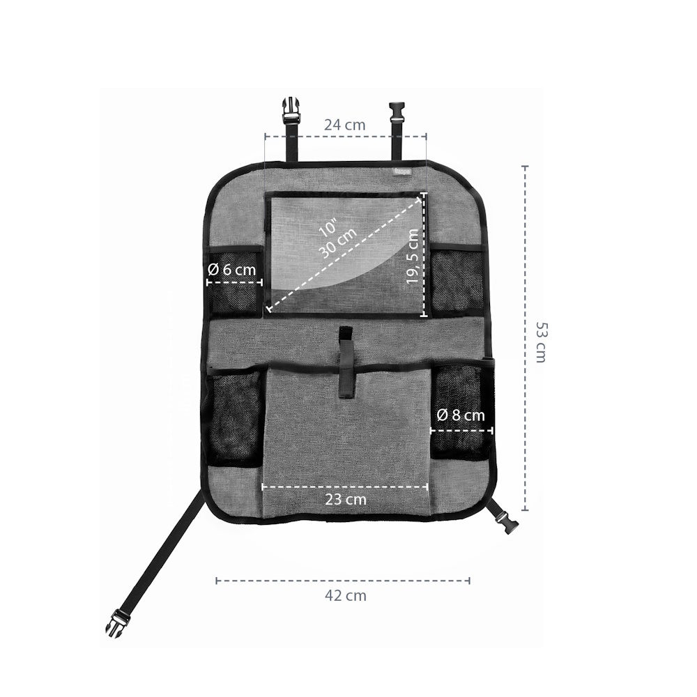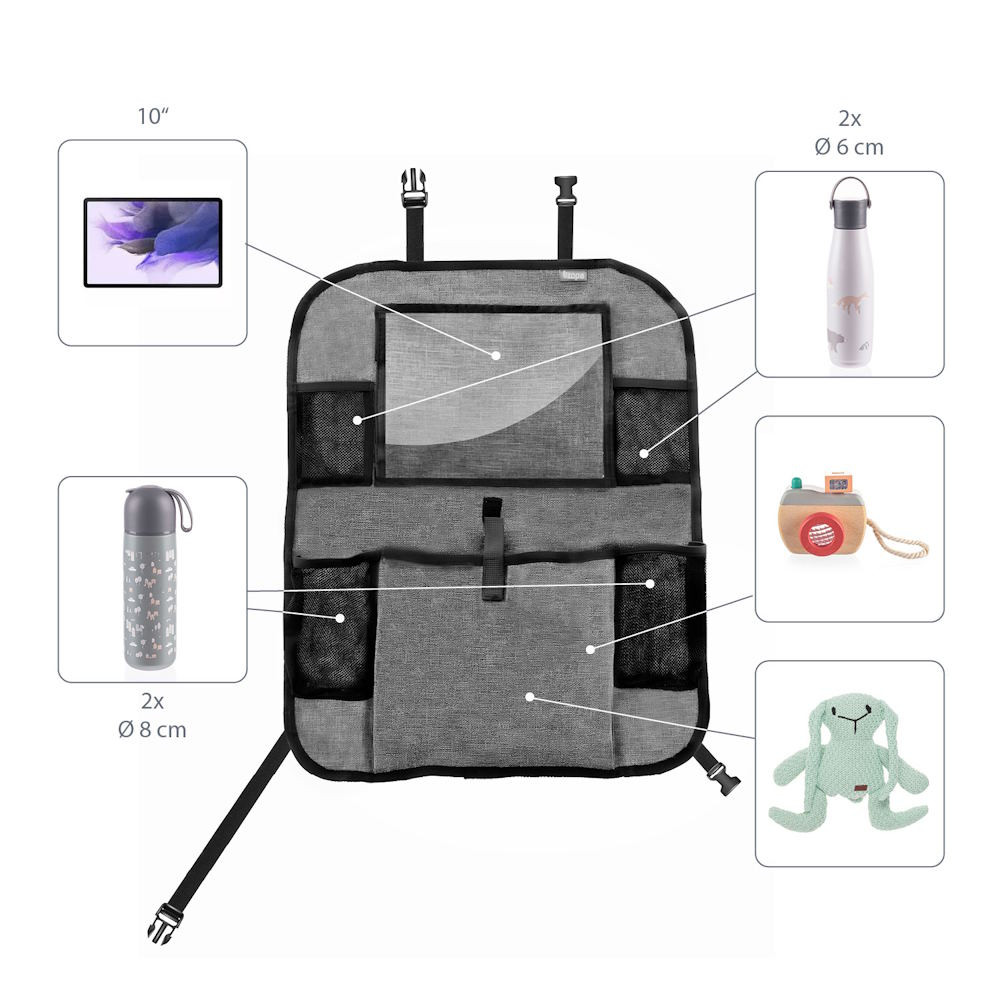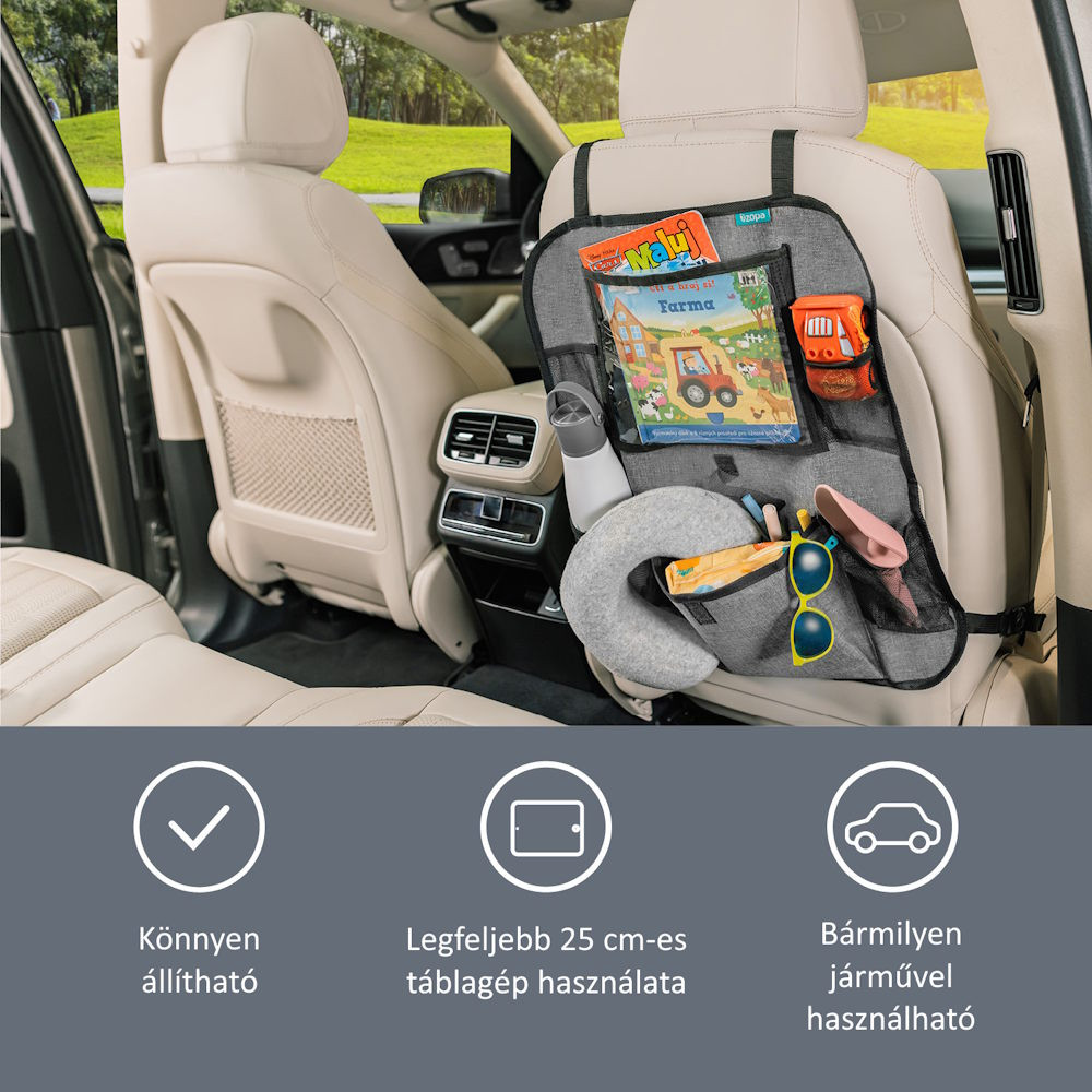 A tablet tartó zsebbel rendelkező praktikus ülésre szerelhető rendező ideális társ, ha gyerekkel utazik. A tablet tartó zseb óvja a tablet érintőképernyőjét, és a segítségével gyorsan hozzáférhető a készülék. Mivel a zseb átlátszó, jól látható, hogy mit tartalmaz. Ezenkívül a rendező két italtartót tartalmaz. Univerzális jellegének köszönhetően az ülés gyakorlatilag minden járművel kompatibilis. A rögzítését állítható hosszúságú praktikus klipek könnyítik meg, amelyeknek köszönhetően szabályozni az elhelyezkedése. Ezenkívül az út során nélkülözhetetlen apróságok tárolására egy további zsebet, valamint két mobilt- és kulcstartó hálós zsebet is tartalmaz.